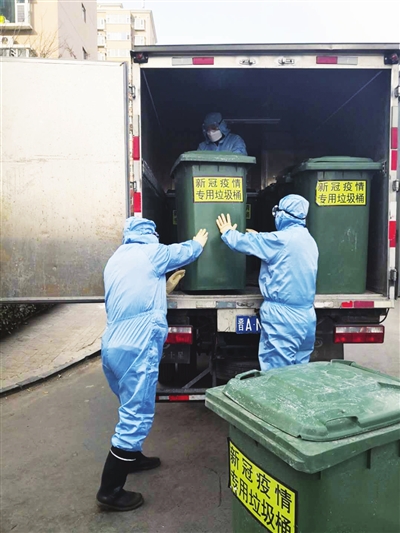 “清运的第一步是消杀,工作人员分层消杀、套两层垃圾袋并扎紧袋口,放入专用垃圾桶密封。每个桶大约能装40公斤,一共装了将近30桶,一直干到次日凌晨。”薛双喜说,1200公斤疫情医废分两次运送,运完一趟,工人把自己身上穿的防护服脱掉,赶紧吃点东西、喝口水,再换上一身防护服、口罩、护目镜等,再次前往老军营小区。