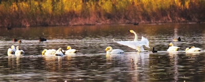 10月27日,在清徐汾河二坝附近,一群白天鹅在汾河湿地栖息、嬉戏,与清澈的河水勾勒出一幅冬日美景。清徐县近年来持续推进工业企业退城入园和关停污染企业工作,生态环境不断改善,汾河水质持续好转。每年初冬、初春都会有成批的天鹅在清泉湖、汾河湿地等地“中转”栖息。 记者 司 勇 通讯员 张太义 摄