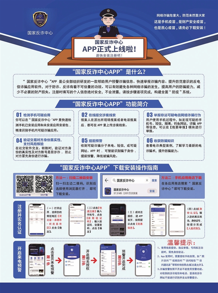 公安部刑侦局会同国家计算机网络与信息安全管理中心、三大网络运营商和有关互联网企业,共同研发了“国家反诈中心APP”,这是目前唯一一款集合了全国大量诈骗信息和诈骗案例的“国字号”软件。