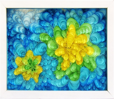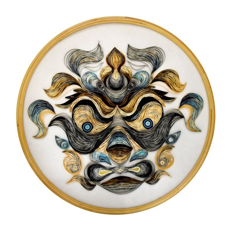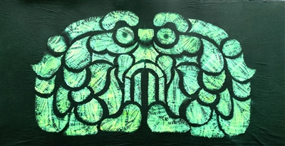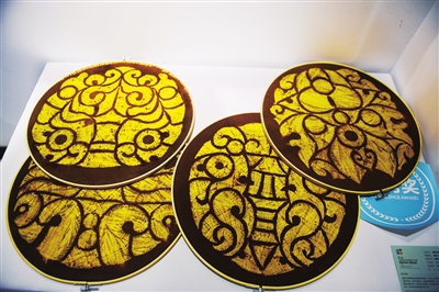展区中,内容最丰富的属传统工艺+非遗创意设计区。一件名为《百扇孝》的展品,设计灵感来自“善”“孝”的传统文化。五个扇形用榫卯与中央圆形连接,组成一个圆。扇面镂空花丝与多层浮雕虚实结合,匠心独具。这一展区还陈列了醒世兽纹衍纸作品、融合山西古建元素的皮具、选取山西青铜器中吞金兽纹、饕餮纹、凤鸟纹等经典纹饰的扎染作品,以及《百鸟朝凤》堆锦刺绣作品、平遥古城全景巨幅木雕等。