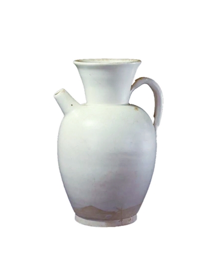 邢窑白瓷传世品以盘、碗居多,瓶类非常少见。这件唐代邢窑白釉壶(左图),高17.5厘米,敞口,长圆腹,平底,小短流,颈与腹部有曲柄相连,通体施白釉。整件器物造型端庄规整,釉色洁白莹润,属邢窑白瓷中的细白瓷,体现出唐代邢窑白瓷“似雪类银”的素雅与优美。其纯净洁白的釉色,端庄秀美的造型,使人感受到大唐盛世雍容华贵的气质,有极高的收藏价值。