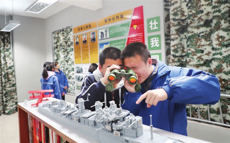 在市第二实验中学国防教育馆内,陈列着大量书籍和模型,11月23日,同学们正在接受爱国主义教育。该校拥有60余年的办学历史,是全国国防教育示范学校。 张昊宇 齐 芳 摄