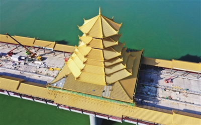 11月24日,工人在柳州凤凰岭大桥风雨亭上铺设铜瓦(无人机照片)。