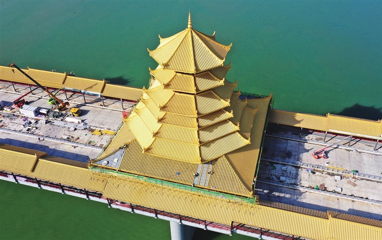 近日,广西柳州市凤凰岭大桥进入施工冲刺阶段,工人们正加紧施工,即将完成铜瓦铺设的大桥仿佛披上一层金色的外衣,成为柳江上一道靓丽风景。 新华社发 (黎寒池 摄)