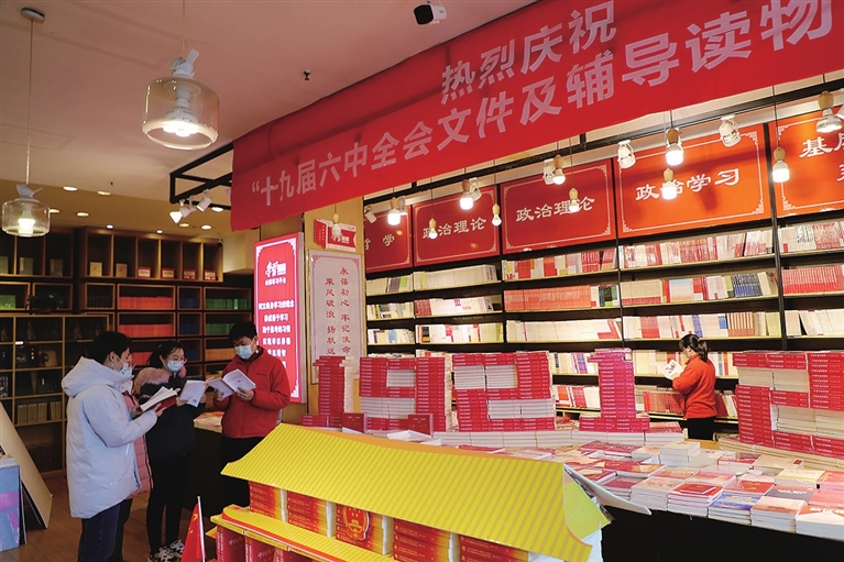 11月24日,山西外文书店里,党的十九届六中全会相关文件及辅导读物摆在最醒目位置。目前,该系列书籍已在图书大厦、外文书店和太原书城三大书店上架发行,接到的预订量达到上千套。张昊宇 摄