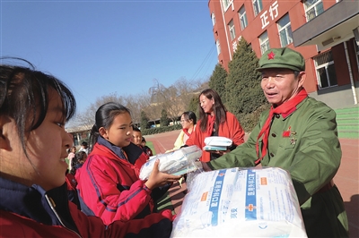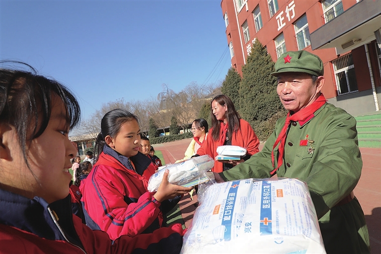 11月25日上午,迎泽街道退役军人服务站来到杏花岭区小返学校,开展爱心捐赠活动。老兵曹继红向该校学生捐赠爱心口罩2000个、学习用品1500套,受到师生们的欢迎。