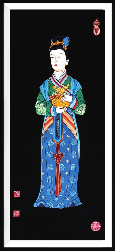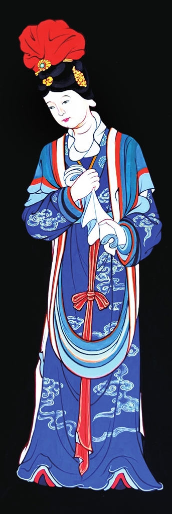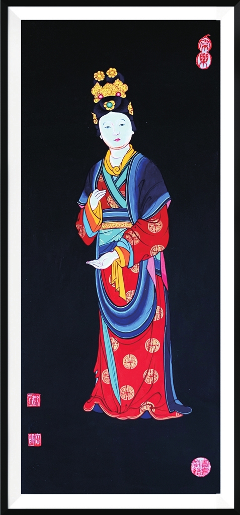 创作中,谢宝明查阅了大量资料,反复观察这些塑像,尝试与她们“对话”。在遵循原作基础上,融入自己的思考,最终确定出《晋祠侍女组图》创作方案。经过绷布、刷胶、磨布、打线、起稿、上色、晕染等一系列艰苦细致的创作过程,一组鲜活生动、充满灵性的晋祠侍女,在谢宝明的笔下“复活”了。