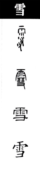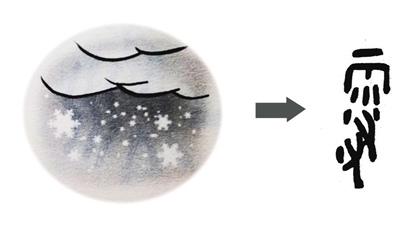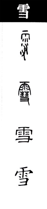 “雪”字是一个会意字,在甲骨文中,其字形上边为“雨”,下边为雪片的形状。而在小篆文中,“雪”字则是一个形声字。它的字形上边仍为“雨”,表示字义,但下边演化成了“彐”,用来表示字音。