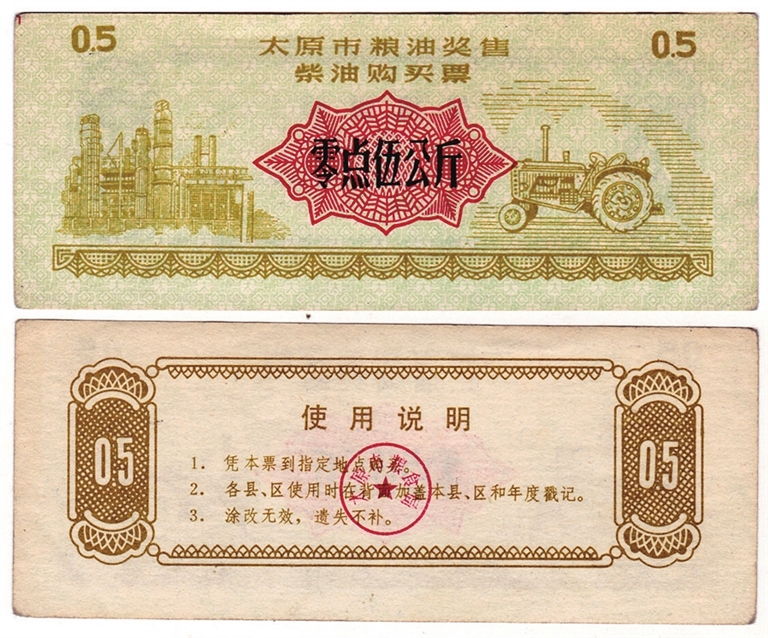 大凡票证,票面上至少应当印有发行年份、发行机关,而笔者当年在山西大同工作时偶得并保存至今的一枚“太原市粮油奖售柴油购买票”,不仅没有年份,且其背面所盖公章为“太原市粮食局”,这不由引起好奇与兴趣。这枚柴油票120毫米×50毫米,面值“零点伍公斤”。我从“公斤”两字上,依据由市斤过渡到公斤的年份,推测其大约在1985年“问世”。至于为何盖有“粮食局”的戳记,大概是因为此票券乃是农民多卖余粮所得的“奖品”,自然当由粮食部门掌控;抑或当时尚无此类票证的专属管理机构,暂由粮食局代为办理。