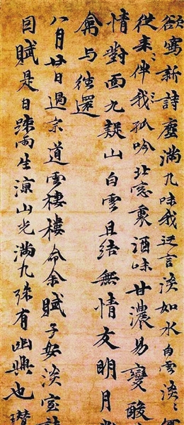 其书法从隶入,有晋人风度。元代书法艺术崇尚柔媚浓妍,倪瓒不为时风所动,师法晋宋之情韵,上溯汉隶之朴拙,由此创造了恬淡瘦劲、静穆秀雅的书风,从其绘画代表作《渔庄秋霁图》的自题诗中便可见一斑。该题款是倪瓒晚年所书,秀逸俊美而无妩媚柔弱之嫌。严整有规矩,行气茂密,却不失淡雅自然宽舒之态,与诗的内容、画面的意境融为一体。