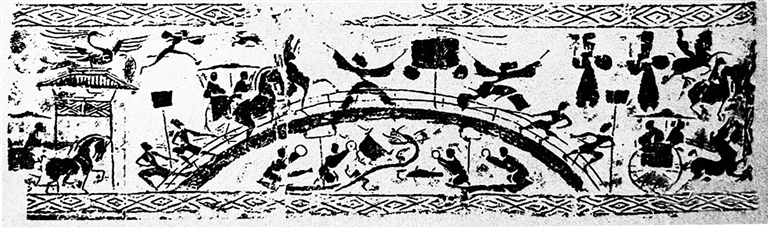 在捞鼎的过程中,虹桥的交通并没有中断:画面的左边一辆轺车正经过顶端饰有凤凰的单阙准备过桥;桥的左端一辆轺车正在爬桥;桥的右端一辆轺车和两个单骑似乎刚刚过桥。在凤阙的右端更远处的空间里,一人正大步飞奔着套兽。总之,生活照旧,被秦始皇十分看重的泗水捞鼎失败,并未影响社会秩序。制砖工匠不厌其烦地反复铺陈桥通路畅,意在暗示秦王失鼎,世事照转,目的依然是贬秦,为汉王朝歌功颂德。
