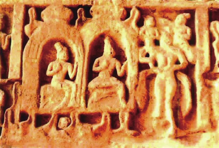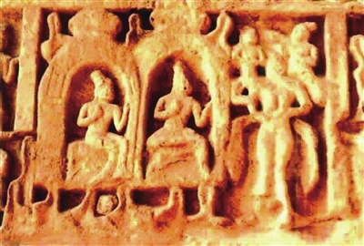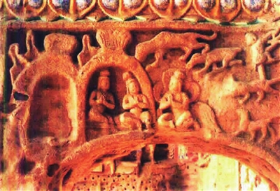 中间一幅图(右下图),右侧一人飘带飞舞,双肩各负双手合十的小人,表示睒子将其父母负于肩上。左侧雕刻两间草庐,各有一人端坐其中,草庐上下雕刻山峦,表示睒子和父母来到山中修行。