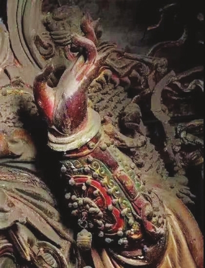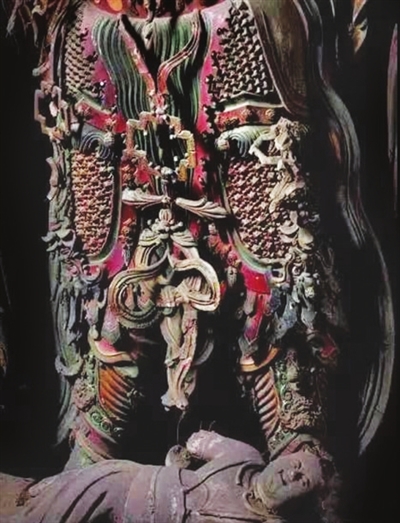 铁佛寺最震撼人心的彩塑,当属环绕佛殿四周的二十四诸天造像。整组作品雕饰繁复、曲线动荡、造型突兀,有极强的绘画感。与传统佛教造像不走极端、追求中庸平和、体现沉静安详的审美语境不同,这组造像显得突兀、另类。
