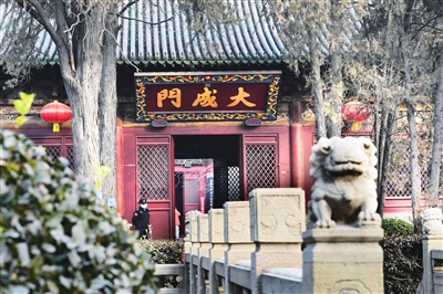 大成门为宫殿式建筑,面阔三间,单檐歇山顶,琉璃瓦覆盖,明间为菱形隔扇门,次间为菱形隔扇窗。