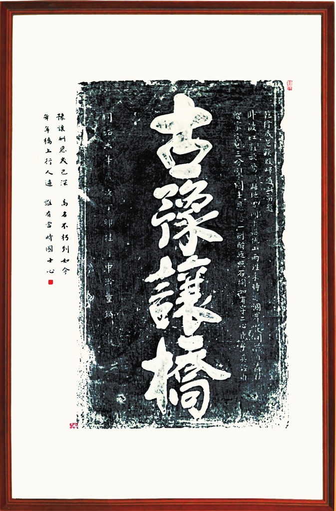 卧波虹影欲惊鸥,此地曾闻手椹愁。山雨往来时涨涸,岸花开落自春秋。智家鼎已三分裂,志士恩凭一剑酬。返照石栏如有字,二心臣子莫径由。 司马迁在《史记·刺客列传》中,一共记述了五位刺客。这些刺客,都是一些侠肝义胆、知恩图报,且不计代价、甚至付出生命也在所不惜的人物,他们都因侠义精神而名垂千古,晋人豫让,便是其中一位。“士为知己者死,女为悦己者容”这句名言,最初也是出自豫让之口。 豫让是春秋战国时期晋卿智瑶的家臣。晋出公二十二年(前453),赵、韩、魏共灭智氏。为给智伯报仇,豫让以漆涂身,吞炭使哑,暗伏桥下,多次谋刺赵襄子未遂,后为赵襄子所捕。临死前,他求得赵襄子衣服,拔剑击斩其衣,以示为主复仇,然后伏剑自杀。他以自己的生命,践行了“士为知己者死”的诺言。 诗中“岸花开落自春秋”“志士恩凭一剑酬”两句,便道出了豫让的侠肝义胆,读来令人荡气回肠。 石碑抬头为“乾隆岁邑侯殷峄过此留题”,“邑侯”即县令。清乾隆年间,太原知县殷峄路过赤桥村,听说了“豫让刺赵”的故事,感佩于豫让的忠义之举,心潮澎湃,赋诗一首,镌刻石碑立于桥头。 殷峄,字桐高,江苏扬州高邮人。擅骈体,尤精诗学,著有《竹栗山庄诗钞》。因才华出众进入太学,后谒选为太原县令,但因不善于悦上,被免归家。 石碑落款为“同治十年岁次丁卯桂月中翰重镌”,表明清同治十年(1871)八月,内阁中书将此诗重刻于豫让就义之地。 此碑原嵌于赤桥村观音堂的外墙上,现安置于刚刚建好的赤桥乡村文化记忆博物馆内。太原市晋阳古城研究所副所长龙真几年前到赤桥村进行考古工作时看到此碑,当时石碑放在村委会,凭着职业敏感,龙真细心地将石碑清理干净,并用墨汁把碑文拓印出来,他欣喜地发现,碑上显现了四个大字——古豫让桥,还配有咏赞豫让的诗句。此次圆通寺复建开放,龙真用拓片的形式将此碑呈现出来,再度引发人们对豫让这位古代义士的崇敬。