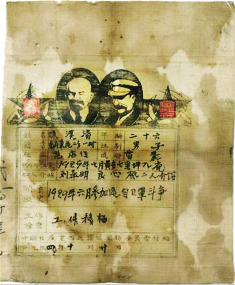 艰苦的长征、血战甘南、宁夏、山西……赴延安、战东北,多少次,行军作战,汗水把陈波的党证浸透;多少次,沿途的奇寒把党证上的汗水凝成冰凌。在穿越鬼子的封锁线时,为防备落入敌手而暴露身份,许多人都把党证销毁了,陈波说:“就凭我这一只胳膊两条残腿,不是红军就是八路,有无党证一个样,落到敌人手里都是死。”所以他一直揣着党证打天下,党证伴他渡难关。
