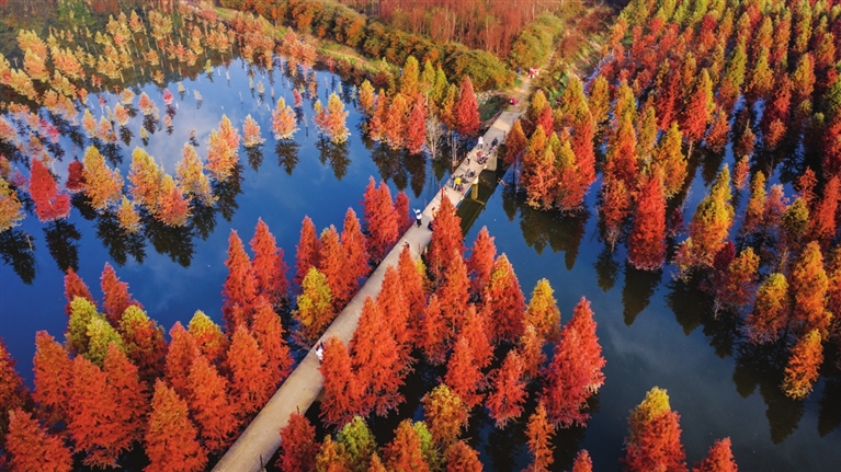 冬日,云南省昆明市盘龙区滇源街道甸尾村水杉湿地的水杉林色彩艳丽,景色如画。这片水杉湿地位于滇池上游、昆明松华坝水源保护区内。 新华社记者 胡 超 摄