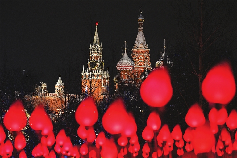 这是12月14日在俄罗斯莫斯科拍摄的克里姆林宫和新年灯饰。 新华社/卫星社