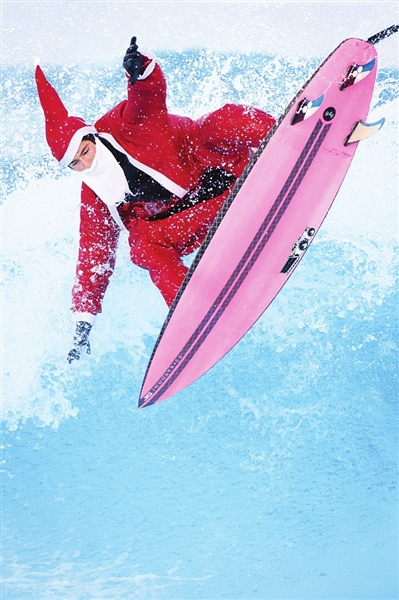 12月15日,打扮成圣诞老人的冲浪手在瑞士锡永的人造冲浪池中冲浪。 新华社/欧新