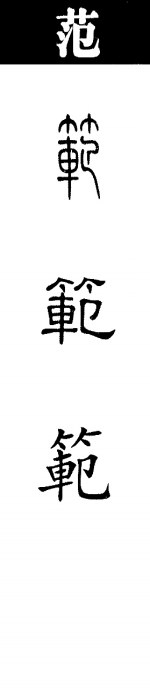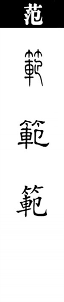 “范”字最初为“範”,本义为古代出行前祭路神,是一个形声字。在小篆文中,其字形左下方像车子的形状,意思是车子出行前祭路神;右边为“犯”,有模子、法则的意思,这里是说祭路神要遵循一定的规矩和形式。后来,“范”常指模子,如“铜范”;现在,又由“模子”引申为榜样,如“他是本年度的劳动模范”。在北京方言中,某人很具时尚感,则被称为“有范儿”。