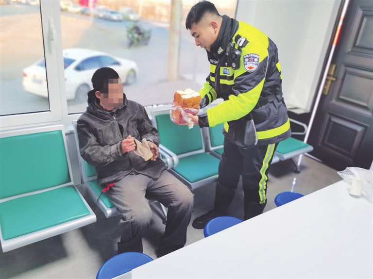 12月17日下午5时许,三中队民警巡逻至北格街宏业东路口时,发现一名蓬头垢面的男子,蜷缩在路边瑟瑟发抖。民警上前询问情况,男子称,自己3天前流浪到我市,一直没有吃饭,十分饥饿。民警将男子带回中队,又拿来热水和食物让他充饥。男子吃饱后,民警对其提供的身份信息进行了核实,确定其在我市没有亲友。为防止男子再次流浪,民警将其送到救助站妥善安置。
