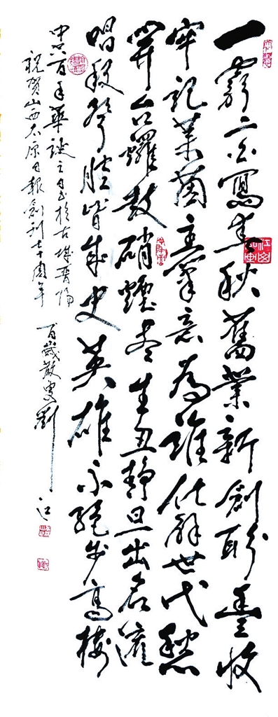 “七一”当天,刘江老就写来了上述那首《贺〈太原日报〉创刊七十周年》的诗。他是著名的书法家,便用行草把这首诗书写成一幅书法作品,并用榜书写了一个硕大的“寿”字,托我转太原日报社。