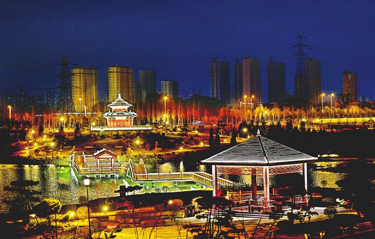 12月27日,汾河景区柴村桥北,流光溢彩的景观灯与汾水交相辉映,成为城北又一别样景观。 邓寅明 摄