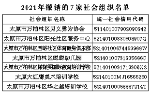 经查实,下列7家社会组织存在两年(含两年)以上未按规定参加年度检查,违反了《民办非企业单位登记管理暂行条例》和《社会团体登记管理条例》的相关规定,决定对下列社会组织作出撤销登记的行政处罚,这些社会组织的法人登记证书正副本及其所有印章同时作废。