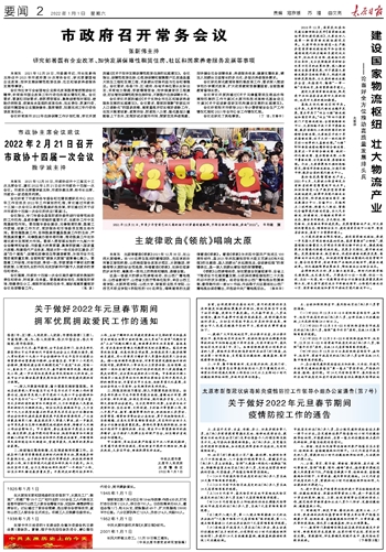 2022年元旦、春节期间,全市各级各部门、驻并各部队要坚持以习近平新时代中国特色社会主义思想为指导,深入贯彻党的十九届六中全会精神和习近平总书记视察山西重要讲话重要指示精神,全面落实省、市第十二次党代会精神,围绕创建全国双拥模范城“十连冠”目标,团结一心,真抓实干,扎实做好元旦、春节期间拥军优属、拥政爱民工作,进一步巩固和发展军政军民团结的大好局面,为我市全方位推动高质量发展和驻并部队转型建设提供有力保障。