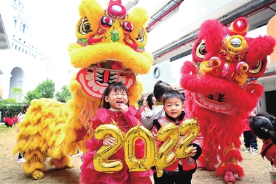 2021年12月31日,在广西柳州市一家幼儿园,两名孩子在舞狮队前展示“2022”字样。