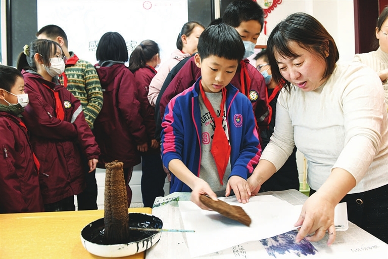 1月5日,太原市第二实验小学将非遗体验纳入校内课后服务,丰富“双减”政策后学生生活。图为学生在老师指导下体验木版年画制作工艺。邓寅明 摄