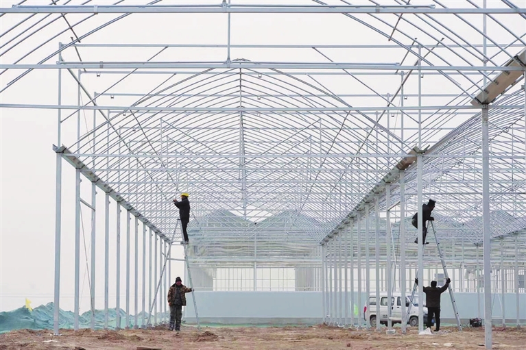 1月10日,阳曲农投现代农业科技示范产业园内,工人们正在搭建智能温室。温室建成后全部采用高科技无土栽培技术,为建设太忻一体化经济区打造全省现代农业样板。李学军 宋卫东 摄