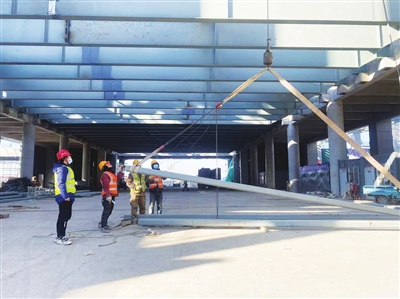 马晋鲁与另外8名工人挪动沉重的钢梁,在两侧提前打好的伸臂钩上,绑扎好吊装起重绳。9米长的钢梁起重绳夹角不得小于60度,确认好吊点位置,一切就绪后方可起吊,直臂吊车缓缓提升。“一、二——起,一、二——起。”10分钟后,吊装到位,工人们分成四组开始焊接……临走,马晋鲁嘱咐工人:“一定要注意安全。”临近中午,管理人员招呼工人们吃饭。在去食堂的路上,马晋鲁说,会展中心的钢结构工程原计划在2月完工,从目前施工进度看,主体预计在1月底前可以完工。
