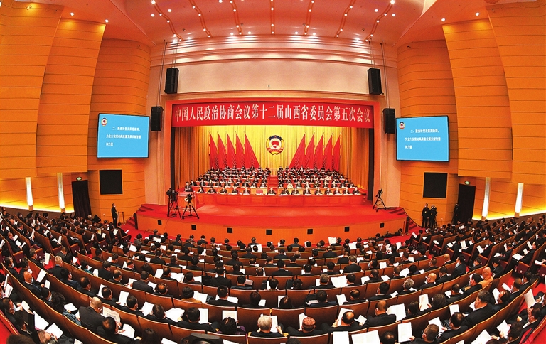 当天上午,省城晴空万里。太原工人文化宫内外布置简朴,庄严隆重。大会主席台正中悬挂着象征全国各族人民大团结的政协会徽,十面鲜艳的红旗分列两侧。会场后方悬挂着“以习近平新时代中国特色社会主义思想为指导,凝聚全方位推动高质量发展的磅礴力量!”横幅。来自各界别、各行业的政协委员齐聚这里出席开幕盛会。