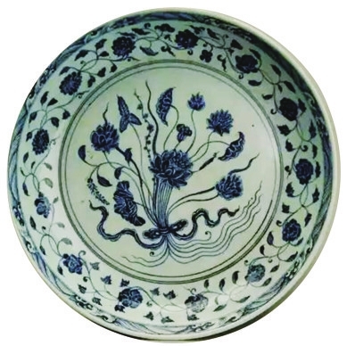 这件明代的青花束莲纹瓷盘(藏于郑州博物馆),饰有富贵吉祥的图案。盘子的内底中间是六朵形态各异的莲花所组成的“一束莲”图案,簇拥着正中一朵绽放的如意莲花,曼妙的构图、多样的花卉,共同组成了象征富贵、吉祥的瓷盘图案。