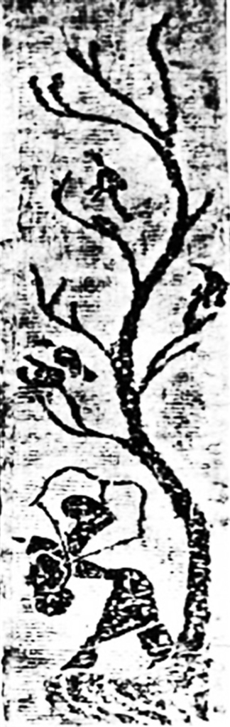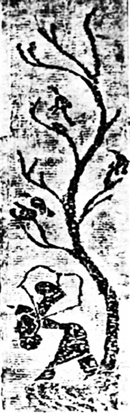 在这块画像石中,作者运用了许多S形的曲线:扶桑树树干、树的枝条、后羿身体躯干的整体形状、后羿的双臂及后羿脚下山峰的纹理等都处理成S形,使图案充满了一波三折的韵律感。