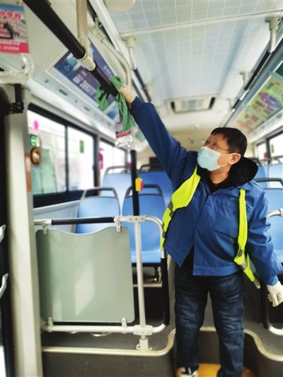 公交车的保洁员又被称为公交车的“美容师”,他们日复一日、年复一年地提水、拖地、擦拭、消毒,不断进行着重复劳作。“现在,清洁一辆大型公交车大概需要5分钟左右,要是遇到雨雪天,清理起来会费点时间。如何快速地将车清洗干净,不少公交保洁员已经摸索出了一套好的方法。”该车队队长王国庆表示,公交保洁员的工作很辛苦,但他们没有丝毫怨言,不仅完成了车辆清洁,还时刻紧绷疫情防控这根弦,认真做好趟次消毒,保证市民的乘车安全。因此,他呼吁广大乘客要自觉维护车厢卫生,并且互相监督,看到有人乱扔垃圾要主动上前劝阻,共同创造干净、整洁、安全的乘车环境。