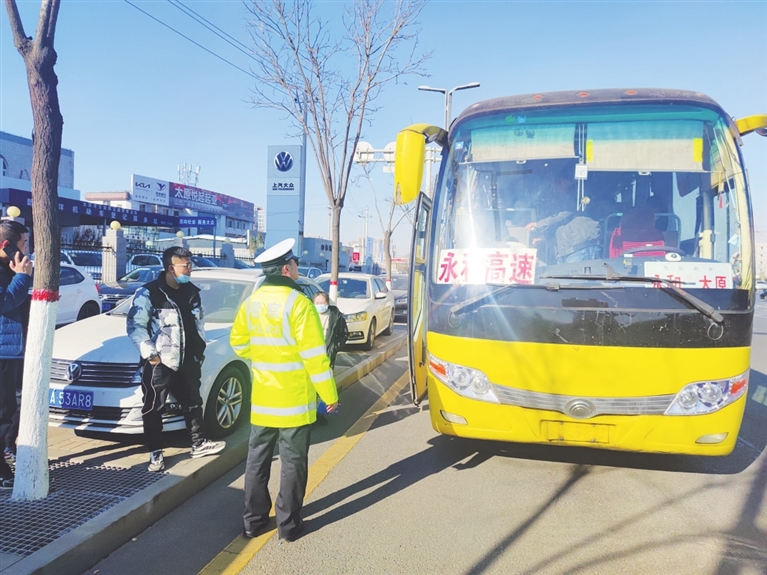 当天下午,交警小店一大队三中队民警在电子街与汾东北路交汇路口对过往车辆进行安全检查时发现,一辆大型客车存在超员情况,于是立即将车辆截停检查。经查,这辆客车核载47人,实际载客56人,超员9人,属于驾驶公路客运车辆载客超过额定成员未达20%的交通违法行为。民警严厉批评了驾驶人任某,并依法对其作出罚款300元、记6分的处罚。随后,民警联系其他车辆,将超员乘客转运,并联系任某所属客运公司负责人,从源头上杜绝安全隐患。