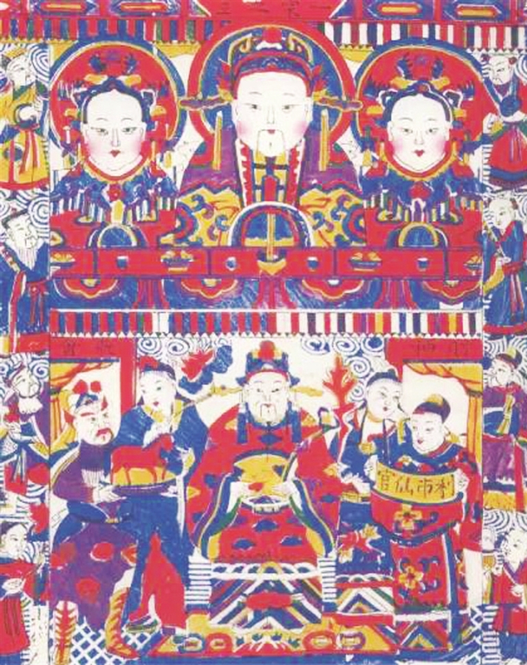 通过这些内容丰富的灶神年画可以看出,一张年画除了灶神形象外,还可以融入多种元素,如有的画着牛郎织女图,表现农耕生活及爱情故事;有的画着菩萨、善财龙女、韦陀、八仙、童子等各类神仙,以祈求保佑一家人的平安幸福;更多是画着聚宝盆、摇钱树、香烛花瓶、状元及第、四季平安这些具有吉祥寓意的图案。各地的灶神年画在艺术特色上虽有差异,又有敷色和墨线两种形式,但总体来说都具有色彩艳丽、线条流畅、布局饱满的特点,在尽情彰显民间审美趣味的同时,更把年味儿淋漓尽致地表现出来,给人们一种人丁兴旺、幸福美满的感觉。