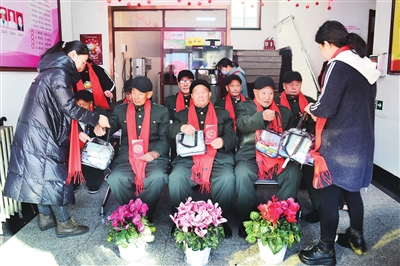 10时许,市退役军人事务局一行数人来到市光荣院,看望慰问这里的老功臣,为每一位老人佩戴红围巾、发放慰问金,并祝他们虎年吉祥,健康长寿。
