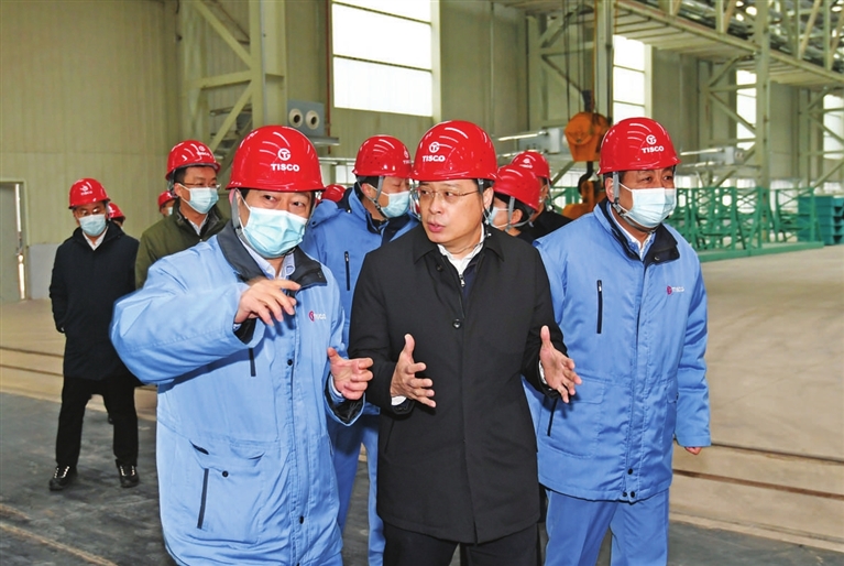 太原钢铁(集团)有限公司是集钢铁生产、加工、配送和贸易等为一体的特大型钢铁联合企业。韦韬来到冷轧硅钢厂,在高端冷轧取向硅钢生产线前实地察看试生产情况,就工艺流程、产能产量、市场需求等与企业负责人深入交流;步入技术中心展厅,听取科研攻关、技术革新、节能环保等工作汇报,观看代表性产品行业应用展示。他对太钢集团长期以来为太原经济社会发展作出的贡献表示感谢,希望企业进一步调整优化产品结构,增加不锈钢、取向硅钢等高端产品生产比重,强化材料深加工匹配能力,不断提高附加值。加大科技研发力度,注重人才队伍建设,大力开发多系列多领域应用的特种钢,推进高性能碳纤维产品工艺研发和批量化生产,持续提升产品的核心竞争力和市场占有率。积极推进减污降碳,强化节能减排新技术研发应用,有效控制能耗和排放强度,全面提升绿色发展水平。提高集聚集群能力,加大对产业链上下游企业招引力度,带动相关配套企业落地,加快产业集聚,做强产业集群。