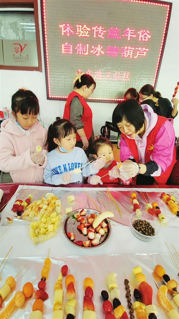 为让辖区少年儿童感受中国传统文化,营造喜庆的节日氛围,2月10日,青年路三社区开展“体验传统年俗,自制冰糖葫芦”活动。孩子们通过活动,了解了冰糖葫芦的制作过程,在满满的收获中尝到浓郁的节日味道。 郭晓华 代 琴 摄