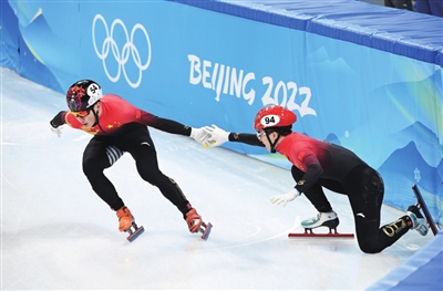 短道速滑赛场,中国队选手任子威、武大靖、孙龙携手晋级男子500米四分之一决赛。在男子5000米接力半决赛中,中国队和加拿大队、意大利队、日本队同组,武大靖、任子威、李文龙、孙龙出战。比赛中李文龙在比赛还剩下11圈时,因脚下冰刀与对手冰刀发生碰撞摔出赛道。加拿大、意大利最后分列小组前两名,进入决赛。李文龙摔倒时中国队位列前两名,依据规则,最终裁判判定中国队也进入决赛。女子1000米比赛,中国队“三朵金花”曲春雨、韩雨桐、张楚桐均折戟四分之一决赛。金牌归属卫冕冠军、荷兰人舒尔廷,她还在四分之一决赛打破了这个项目的世界纪录。