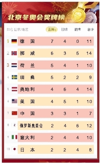 北京冬奥会奖牌榜