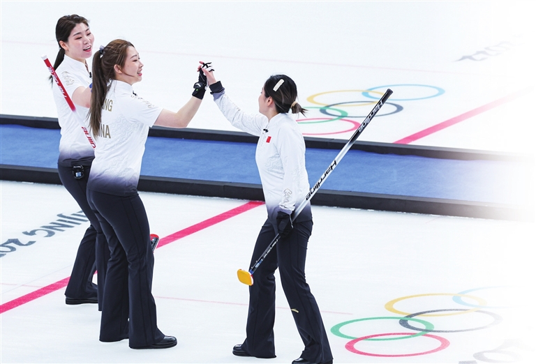 第六局,中国队掌控了比赛主动权,形成四分牵制局面,韩国队旋进后手得一分。第七局中国队如愿“流局”,将后手权保留至下一局。第八局局势稍显复杂,王芮最后一投精准击打为中国队后手赢得宝贵两分,5:4全场第一次取得领先。第九局韩国队希望保留决胜局的后手优势,选择“流局”。第十局,王芮在关键时刻心如止水,打出精彩“双飞”,韩国队队长金恩贞后手旋进得一分将总比分扳平,中国队带着后手优势进入加赛局。