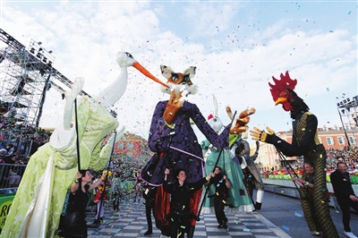 2月13日,演员在法国尼斯狂欢节“鲜花大战”活动中表演。第137届尼斯狂欢节于2月11日至27日举行。在狂欢节“鲜花大战”活动中,游行彩车被鲜花装饰,花车上的表演者将鲜花抛向观众,场面十分壮观。 新华社发 (塞尔日·阿乌齐 摄)