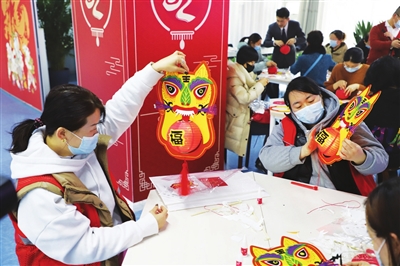 “将卡纸上的图形裁剪下来,这是老虎的眼睛和眉毛;粘贴、嵌套,再挂上喜气洋洋的红灯笼……”工作人员一边耐心地讲解制作步骤,一边给大家做示范。