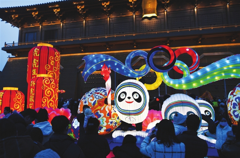 2月15日,市民在西安大明宫国家遗址公园参观冬奥会主题彩灯。