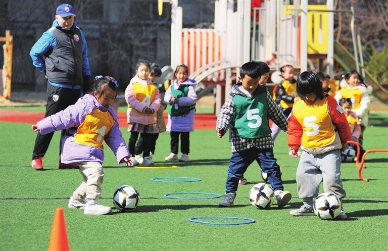 2月23日,刚刚入选全国足球特色幼儿园的杏花岭区第一幼儿园内,孩子们在教练的指导下练习足球技巧。
