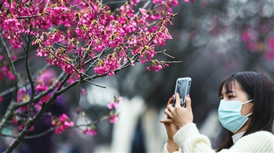 当下,广西南宁市石门森林公园里樱花盛放,吸引众多市民和游客前来观赏。